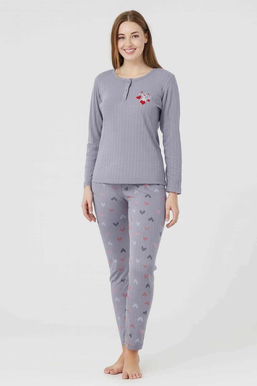 Kadın 05020 Uzun Kol % 100 Pamuk Raporlu İnterlok Pijama Takımı FÜME (05020)
