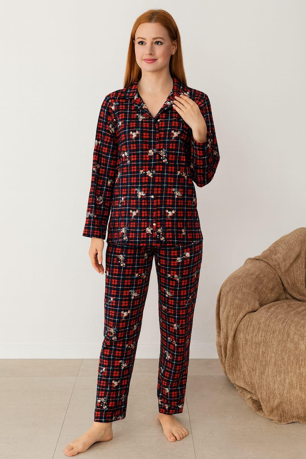 Kadın 02212 Düğmeli % 100 Pamuk Süet Pijama Takımı BORDO