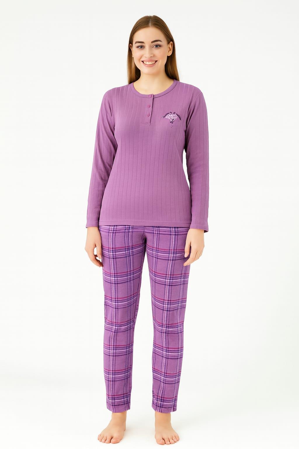 Kadın 05031 Uzun Kol % 100 Pamuk Raporlu İnterlok Pijama Takımı MOR (05031)