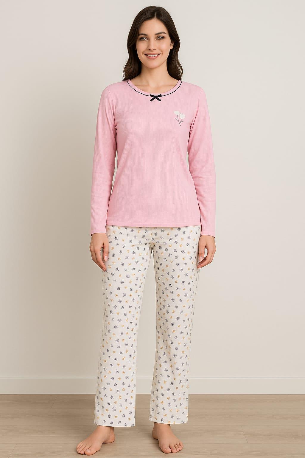 Kadın 06027 Raporlu İnterlok Uzun Kol Pijama Takımı PEMBE