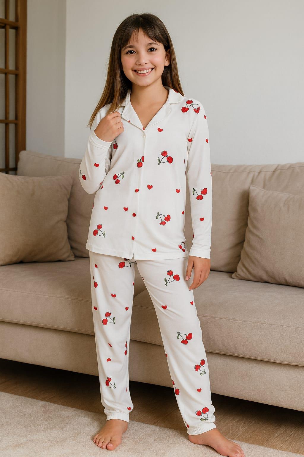 Kız Çocuk 015291 Yakalı Düğmeli Süet Pijama Takımı BEYAZ (15291)