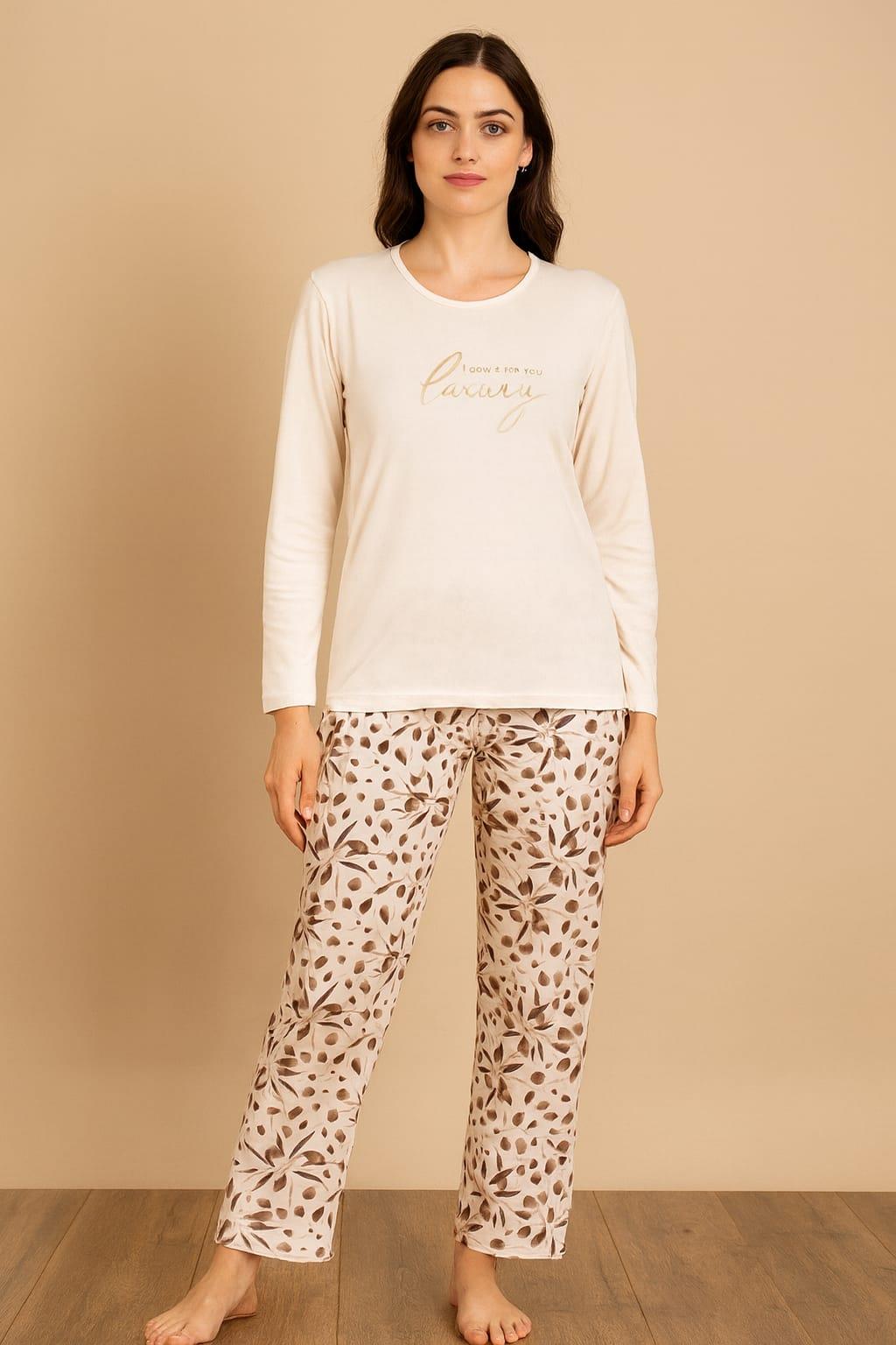 Kadın 20546 Uzun Kol Milan % 100 Pamuk Pijama Takımı bej