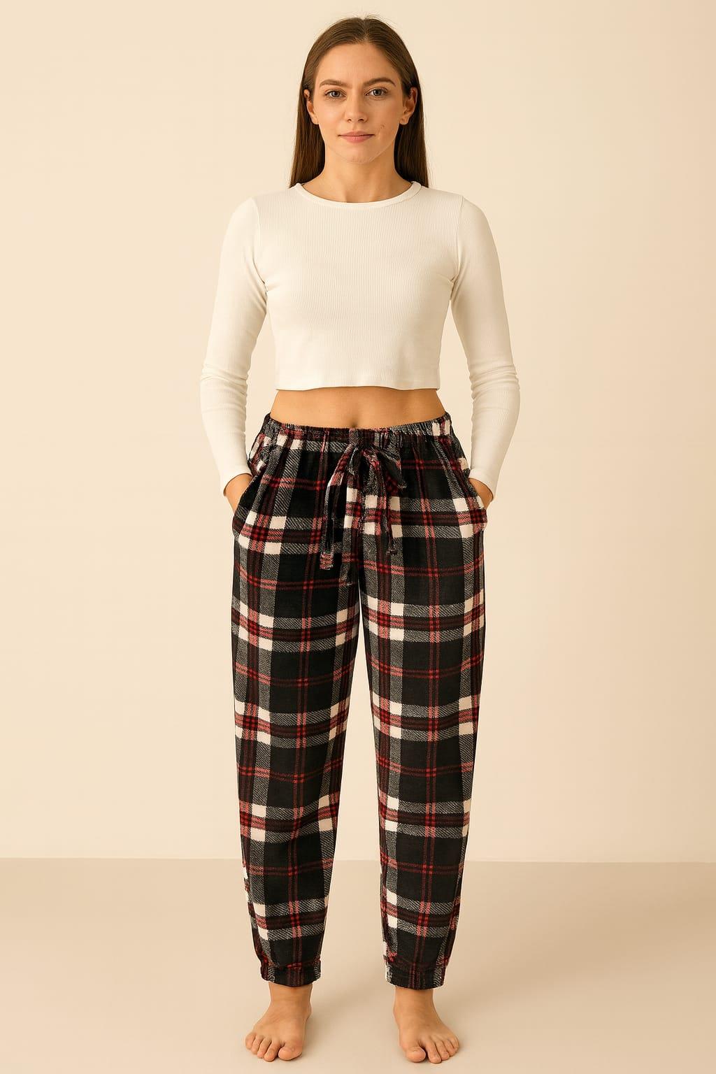 Kadın Ekose Desenli Cepli Paça Lastikli Kadife Tek Alt SİYAH
