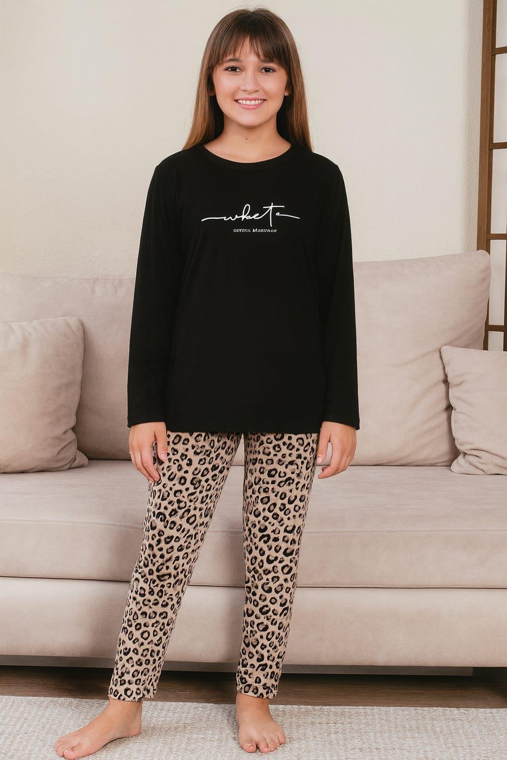 Kız Çocuk 15295 Desenli Uzun Kol Milan Pijama Takımı SİYAH