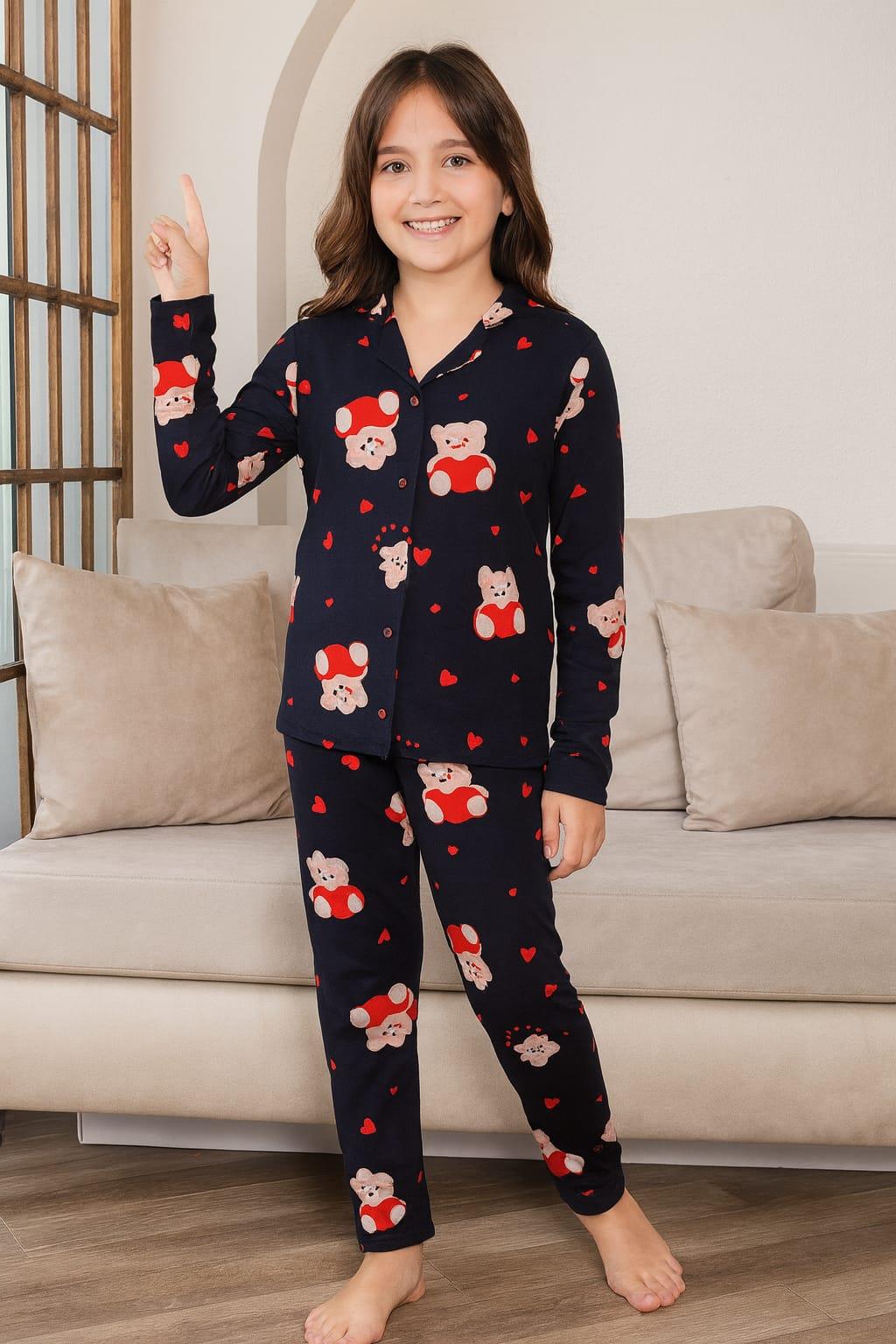 Kız Çocuk 15429 Milan Önü Düğmeli Uzun Kol Pijama Takımı LACİVERT